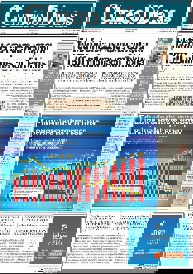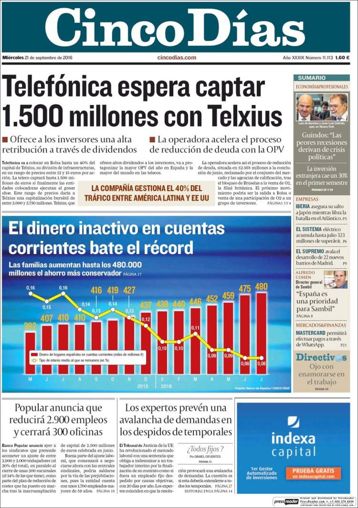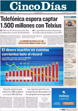 CINCO DÍAS: "Telefónica espera captar 1.500 millones con Telxius"; "El dinero inactivo en cuentas corrientes bate el récord"; "Popular anuncia que reducirá 2.900 empleos y cerrará 300 oficinas"; "Los expertos prevén una avalancha de demandas en los despidos temporales".