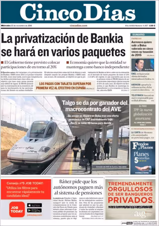 CINCO DÍAS: "La privatización de Bankia se hará en varios paquetes"; "Talgo se da por ganador del macrocontrato del AVE"; "Báñez pide que los autónomos paguen más al sistema de pensiones"; "Aemnova quiere salir a Bolsa valorada en cinco veces su tasación de 2015"; "Los pagos con tarjeta superan por primera vez al efectivo en España".