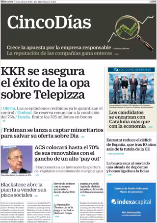 CINCO DÍAS: "KKR se asegura el éxito de la opa sobre Telepizza"; "Fridman se lanza a captar minoritarios para salvar su oferta sobre Dia"; "ACS colocará hasta el 70% de sus renovables con el gancho de un alto 'pay out'"; "Blackstone abre la puerta a vender sus pisos sociales".