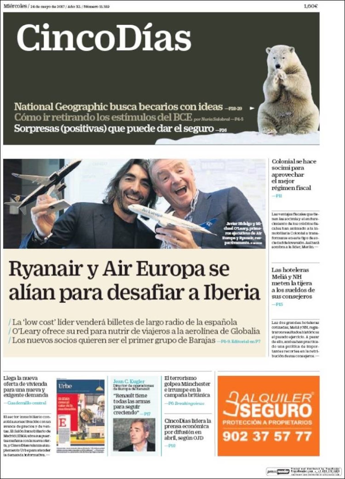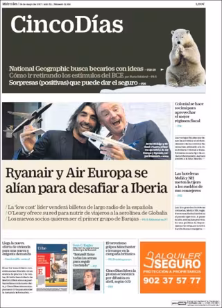 CINCO DÍAS: "Ryanair y Air Europa se alían para desafiar a Iberia"; "Llega la nueva oferta de vivienda para una nueva y exigente demanda"; "Colonial se hace socimi para aprovechar el mejor régimen fiscal"; "Las hoteleras Meliá y NH meten la tijera a los sueldos de sus consejeros".