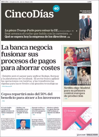 CINCO DÍAS: "La banca negocia fusionar sus procesos de pagos para ahorrar costes"; "Cepsa repartirá más del 50% del beneficio para atraer a los inversores"; "Netflix elige Madrid para su primera central europea de producción".