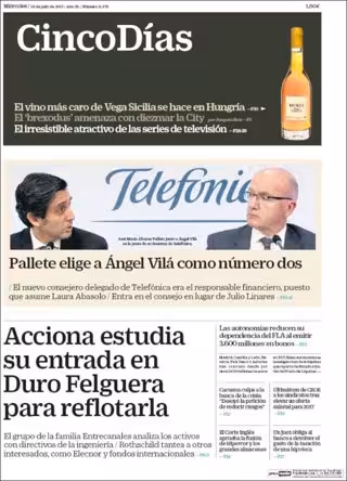 CINCO DÍAS: "Pallete elige a Ángel Vilá como número dos"; "Acciona estudia su entrada en Duro Felguera para reflotarla"; "Las autonomías reducen su dependencia del FLA al emitir 3.600 millones en bonos".