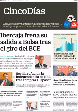 CINCO DÍAS: "Ibercaja frena su salida a Bolsa tras el giro del BCE"; "Sevilla refuerza la independencia de REE tras comprar Hispasat"; "Las cotizadas dan 421.000 millones de dividendo en 18 años".