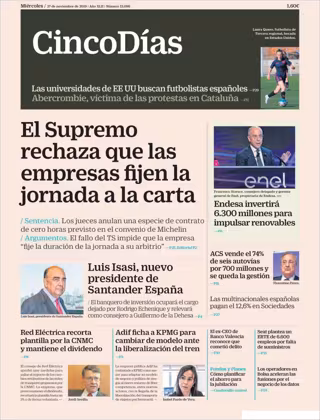 CINCO DÍAS: "El Supremo rechaza que las empresas fijen la jornada a la carta"; "Luis Isasi, nuevo presidente de Santander España"; "Red Eléctrica recorta plantilla por la CNMC y mantiene el dividendo".