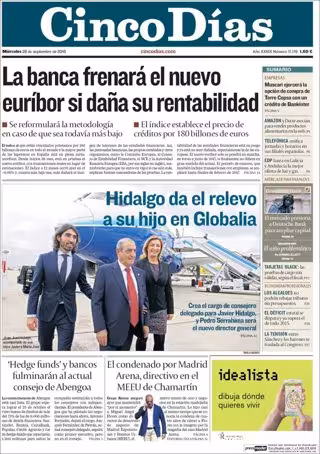 CINCO DÍAS: "La banca frenará el nuevo euribor su daña su rentabilidad"; "Hidalgo da el relevo a su hijo en Globalia"; "'Hedge funds' y bancos fulminarán al actual consejo de Abengoa"; "El condenado por Madrid Arena, directivo en el MEEU de Chamartín"; "Muscari ejercerá la opción de compra de Torre Cepsa con un crédito de Bankinter".