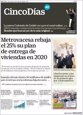 CINCO DÍAS: "Metrovacesa rebaja el 25% su plan de entrega de viviendas en 2020"; "España afronta hasta 90 millones de multa por el retraso en la reforma hipotecaria"; "Sánchez pone a las empresas en el foco de su primera gira por Latinoamérica".