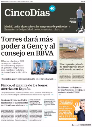 CINCO DÍAS: "Torres dará más poder a Genç y al consejo en BBVA"; "Pimco, gigante de los bonos aterriza en España";" El aeropuerto privado en Madrid prevé 1.950 millones de inversión".