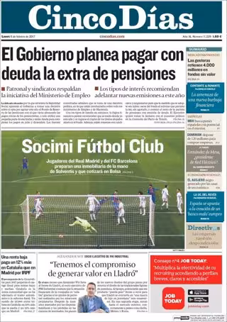 CINCO DÍAS: "El Gobierno planea pagar con deuda la extra de las pensiones"; "Socimi Fútbol Club"; El socio ejecutivo de PHI Industrial, Alexander Wit: "Tenemos el compromiso de generar valor en Lladró"; "Una renta baja paga un 12% más en Cataluña en Madrid por IRPF".