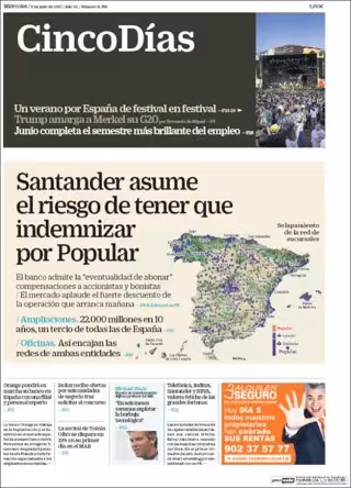 CINCO DÍAS: "Santander asume el riesgo de tener que indeminzar por Popular"; "Orange pondrá en marcha su banco en España con una filial y personal experto"; "Isolux recibe ofertas por seis unidades de negocio tras solicitar el concurso".
