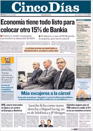 CINCO DÍAS: "Economía tiene todo listo para colocar otro 15% de Bankia"; "Más excajeros a la cárcel"; "OHL cierra mercados en Asia y se centra en Europa y América"; "Saracho firma como mano derecha a Miguel Escrig, un ex de Telefónica y JP Morgan"; "OHL cierra mercados en Asia y se centra en Europa y América"; "Guindos augura que el PIB volverá a subir el 3% si no se cometen errores".