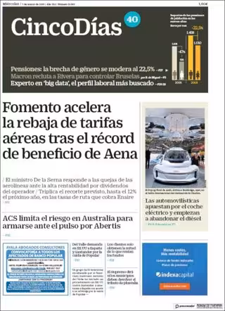 CINCO DÍAS: "Fomento acelera la rebaja de tarifas aéreas tras el récord de beneficio de Aena"; "ACS limita el riesgo de Australia para armarse ante el pulso por Abertis"; "Las automovilísticas apuestan por el coche eléctrico y empiezan a abandonar el diésel".