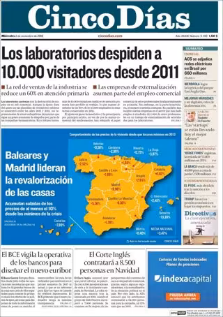 CINCO DÍAS: "Los laboratorios despiden a 10.000 visitadores desde 2011"; "Baleares y Madrid lideran la revalorización de las casas"; "El BCE vigila la operativa de los bancos para diseñar el nuevo euríbor"; "El Corte Inglés cotratará a 8.500 personas en Navidad".