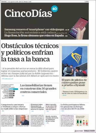 CINCO DÍAS: "Obstáculos técnicos y políticos enfrían la tasa a la banca"; "El paro de pilotos de cuatro países pone a prueba a Ryanair"; "Las inmobiliarias tienen en construcción 30 grandes centros comerciales"; "La Bolsa portuguesa lidera las ganancias en Europa con un alza del 5% en 2018".