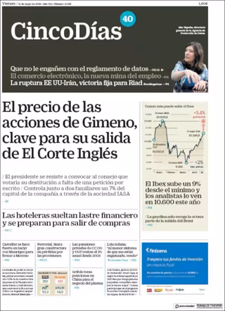 CINCO DÍAS: "El precio de las acciones de Gimeno, clave para su salida de El Corte Inglés"; "Las hoteleras sueltan lastre financiero y se preparan para salir de compras"; "El Ibex sube un 9% desde mínimo y los analistas lo ven en 10.600 este año".