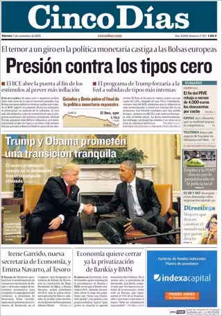 CINCO DÍAS: "Presión contra los tipos cero"; "Trump y Obama prometen una transición tranquila"; "Irene Garrido, nueva secretaria de Economía, y Emma Navarro, al Tesoro"; "Economía quiere cerrar ya la privatización de Bankia y BMN"; "El fin del PIVE rebaja a menos de 4.000 euros los descuentos por coche".