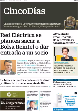 CINCO DÍAS: "Red Eléctrica se plantea sacar a Bolsa Reintel o dar entrada a un socio"; "ACS estudia crear una filial de renovables y sacarla a cotizar"; "La banca acreedora cede ante Fridman y ultima la firma del rescate de Dia".