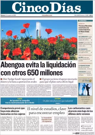 CINCO DÍAS: "Abengoa evita la liquidación con otros 650 millones"; "Competencia prevé que haya más alianzas bancarias en los cajeros"; "El nivel de estudios, clave para encontrar empleo"; "Los carburantes caen al preciomás bajo de los últimos siete veranos"; "Técnicas Reunidas construirá una central eléctrica en Reino Unido".