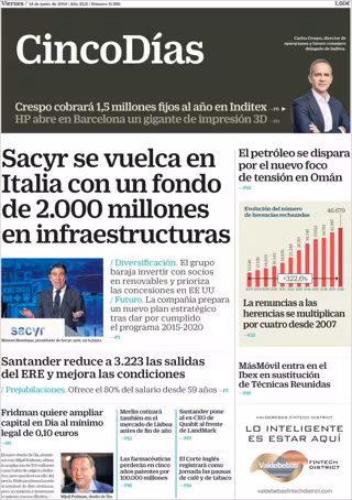 CINCO DÍAS: "Sacyr se vuelca en Italia con un fondo de 2.000 millones en infraestructuras"; "El petróleo se dispara por el nuevo foco de tensión de Omán"; "Santander reduce a 3.223 las salidas del ERE y mejora las condiciones".