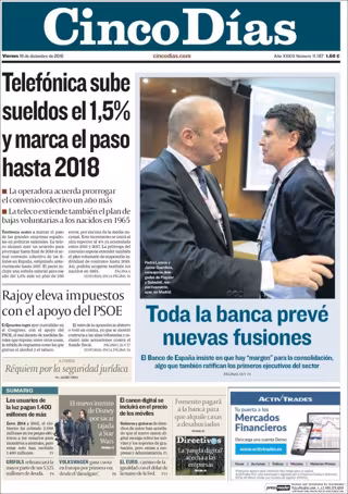CINCO DÍAS: "Telefónica sube sueldos el 1,5% y marca el paso hasta 2018"; "Rajoy eleva impuestos con el apoyo del PSOE"; "Toda la banca prevé nuevas fusiones"; "Los usuarios de la luz pagan 1.400 millones de más"; "El canon digital se incluirá en el precio de los móviles".