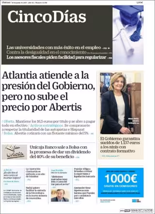 CINCO DÍAS: "Atlantia atiende a la presión del Gobierno, pero no sube el precio por Abertis"; "Unicaja Banco sale a Bolsa con la promesa de dar un dividendo del 40% de su beneficio"; "El Gobierno garantiza sueldos de 1.137 euros a los ninis con contrato formativo"; "La Operación Chamartín se enfrenta a un año de trámites".