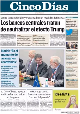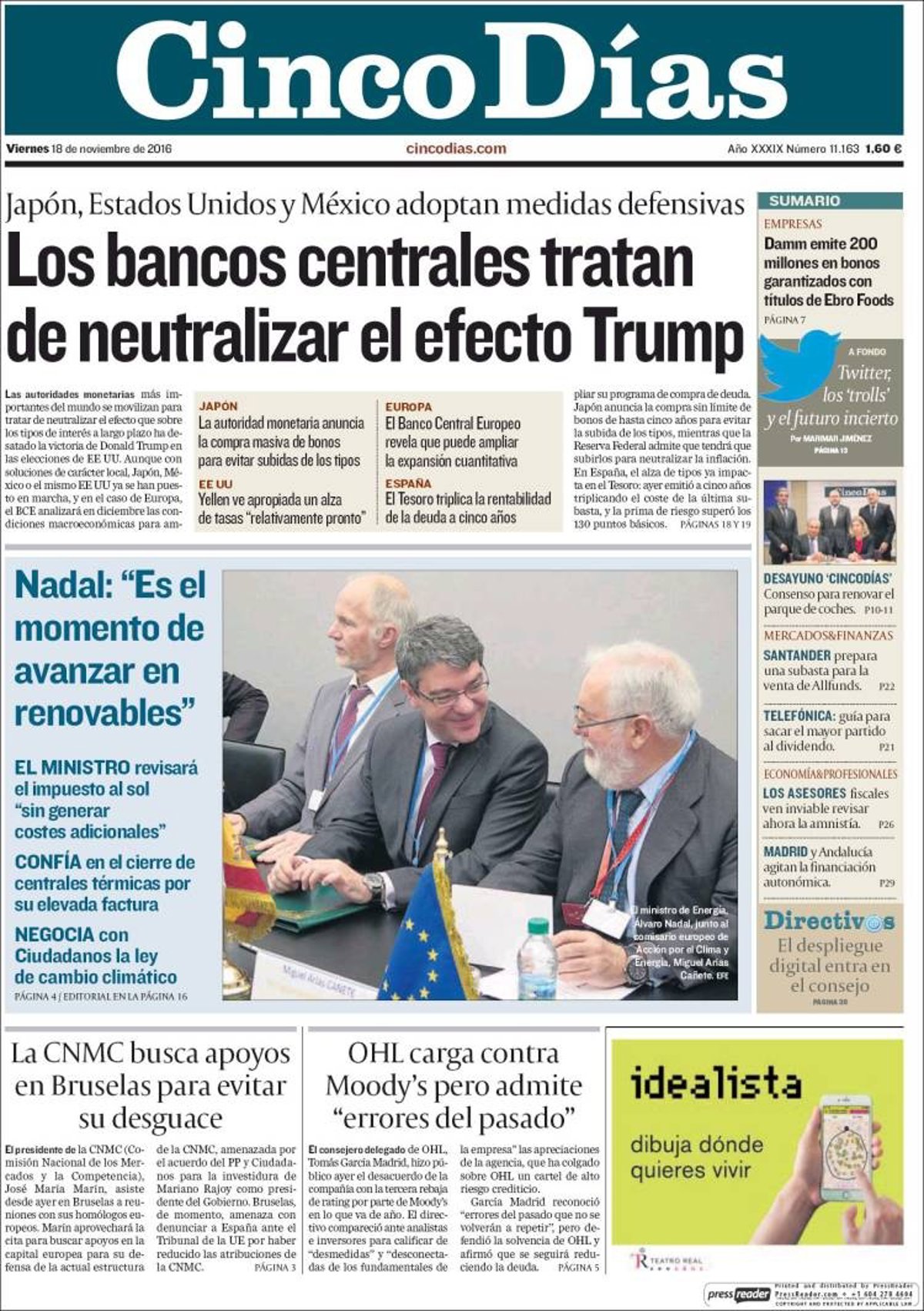 CINCO DÍAS: "Los bancos centrales tratan de neutralizar el efecto Trump"; Nadal: "Es el momento de avanzar en renovables"; "La CNMC busca apoyos en Bruselas para evitar su desguace"; "OHL carga contra Moody's pero admite 'errores del pasado'".
