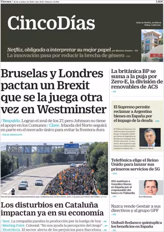CINCO DÍAS: "Bruselas y Londres pactan un Brexit que se la juega otra vez en Westminster"; "La británica BP se suma a la puja por Zero-E, la división de renovables de ACS".