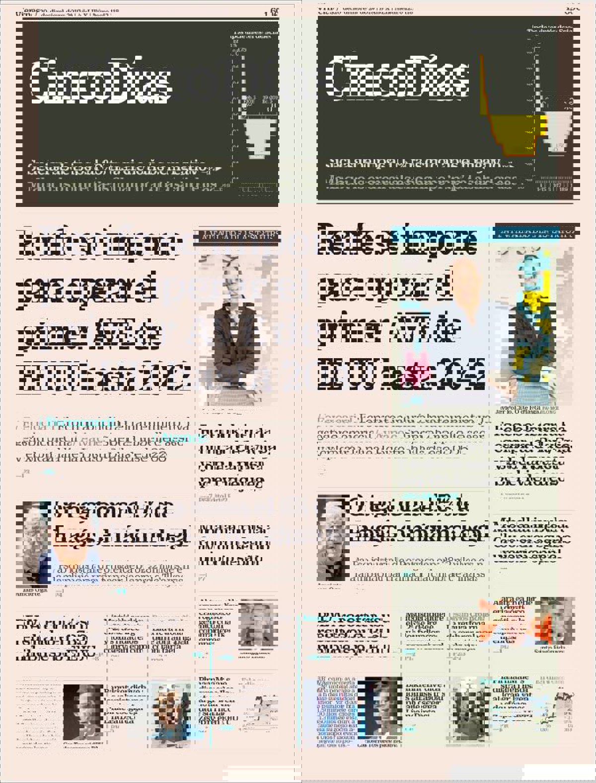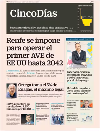 CINCO DÍAS: "Renfe se impone para operar el primer AVE de EE UU hasta 2042"; "Ortega toma el 5% de Enagás, el máximo legal"; "BBVA recortará su resultado en 1.350 millones por EE UU"; "Facebook cierra la compra de PlayGiga y sube la apuesta por el videojuego".