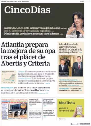 CINCO DÍAS: "Atlantia prepara la mejora de su opa tras el plácet de Abertis y Criteria"; "Sabadell traslada la presidencia a Madrid y Caixabank analiza qué hacer"; "Las acciones de la filial Cellnex baten su récord con American Tower en el horizonte".