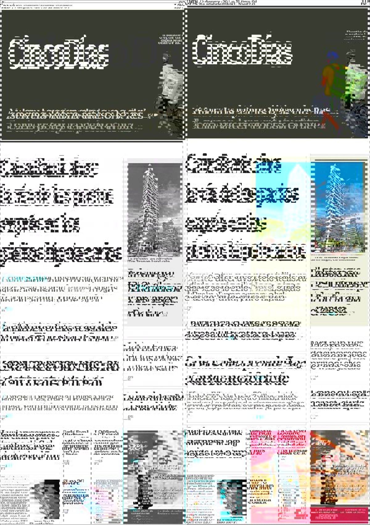 CINCO DÍAS: "CaixaBank abre la vía de los pactos exprés en los pleitos hipotecarios"; "Blackstone paga a UBS 100 millones por la Torre Tarragona en Barcelona".