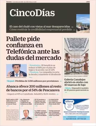 CINCO DÍAS: "Pallete pide confianza en Telefónica ante las dudas del mercado"; "Abanca ofrece 200 millones al resto de bancos por el 54% de Pescanova"; "Galería Canalejas abrirá en otoño con 40 marcas de lujo".