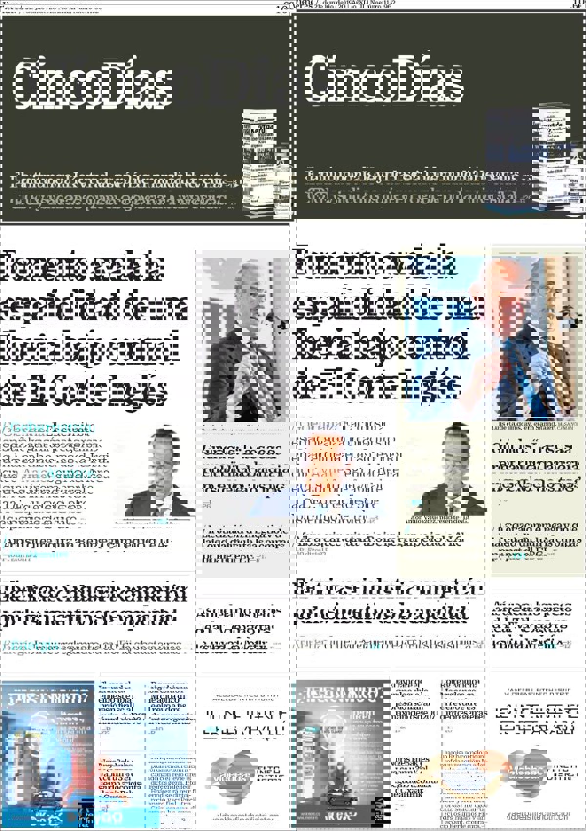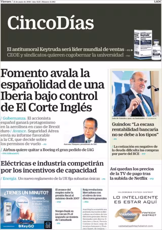 CINCO DÍAS: "Fomento avala la españolidad de una Iberia bajo control de El Corte Inglés"; "Eléctricas e industria competirán por los incentivos de capacidad"; "Guindos: 'La escasa rentabilidad bancaria no se debe a los tipos'"; "Así quedan los precios de la TV de pago tras la subida de Netflix".