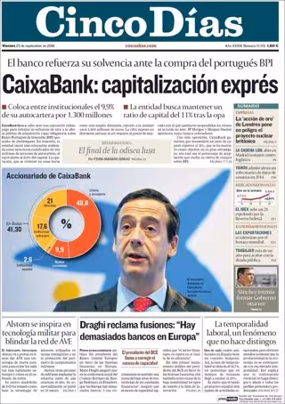 CINCO DÍAS: "CaixaBank: capitalización exprés"; "Draghi reclama fusiones: 'Hay demasiados bancos en Europa'"; "La temporalidad laboral, un fenómeno que no hace distingos"; "La 'acción de oro' de Londres pone en peligro el proyecto nuclear británico".