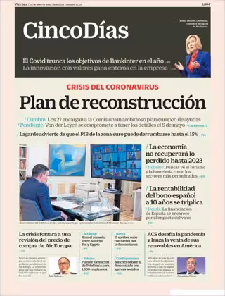 CINCO DÍAS: "Plan de reconstrucción"; "La economía no recuperará lo perdido hasta 2023"; "La rentabilidad del bono español a 10 años se triplica"; "ACS desafía la pandemia y lanza la venta de sus renovables en América".