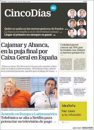 CINCO DÍAS: "Cajamar y Abanca, en la puja final por Caixa Geral en España"; "Colonial prevé crecer un 70% por la fusión con Axiare y nuevos proyectos"; "Acuerdo en Europa y Latinoamérica: Telefónica se alía a Netflix para potenciar su televisión de pago".