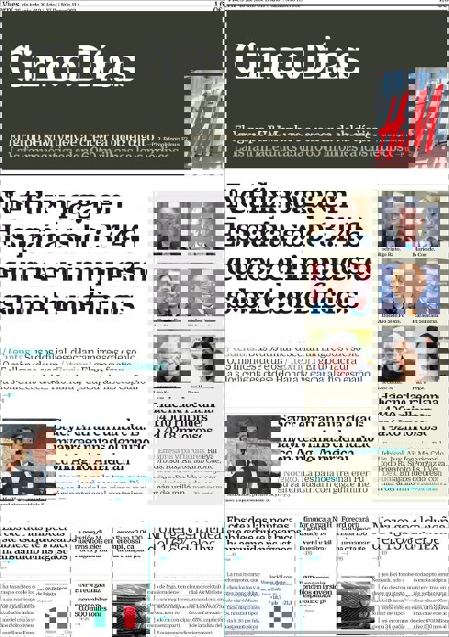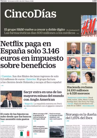 CINCO DÍAS: "Netflix paga en España solo 3.146 euros en impuesto sobre beneficios"; "Hacienda reclama 14.100 millones a 4.028 morosos"; "Sacyr entra en una de las mayores minas del mundo con Anglo American".