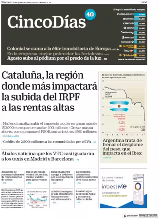 CINCO DÍAS: "Cataluña, la región donde más impactará la subida del IRPF a las rentas altas"; "Ábalos vaticina que los VTC casi igualarán a los taxis en Madrid y Barcelona"; "Argentina trata de frenar el desplome del peso, que impacta en el Ibex"; "Crédito de 2.500 millones a las comunidades por el IVA".