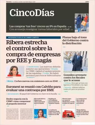 CINCO DÍAS: "Ribera estrecha el control sobre la compra de empresas por REE y Enagás"; "Euronext se reunió con Calviño para evaluar una contraopa por BME"; "González arremete contra los fiscales que le acusan".