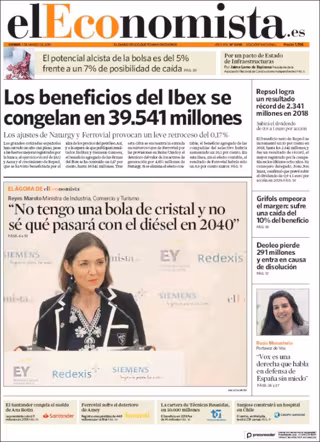 EL ECONOMISTA: "Los beneficios del Ibex se congelan en 39.541 millones"; La ministra de Industria, Comercio y Turismo, Reyes Maroto: "No tengo una bola de cristal y no sé qué pasará con el diésel en 2040"; "Repsol logra un resultado récord de 2.341 millones en 2018"; "Grifols empeora el margen: sufre una caída del 10% del beneficio".