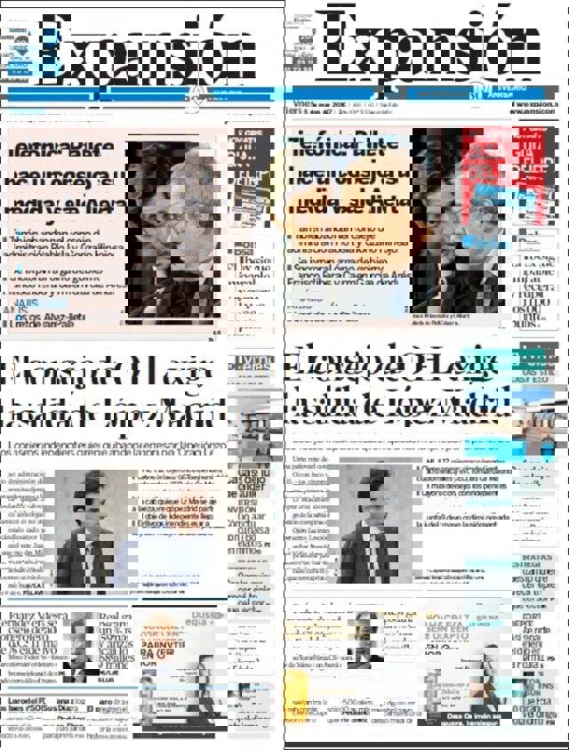 EXPANSIÓN: "Telefónica: Pallete hace un consejo a su medida y sale Alierta"; "El consejo de OHL exige la salida de López Madrid"; "Fernández Verdes será consejero delegado de ACS el 11 de mayo"; "Repsol gana un 59% más y alcanza los 689 millones"; "El Ibex sigue imparable y recupera los 11.000 puntos".