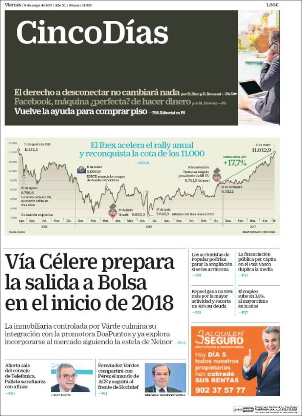 CINCO DÍAS: "El Ibex acelera el rally anual y reconquista la cota de los 11.000"; "Vía Célere prepara la salida a Bolsa en el inicio de 2018"; "Alierta sale del consejo de Telefónica, Pallete se refuerza con afines"; "Fernández Verdes compartirá con Pérez el mando de ACS y seguirá al frente de Hochtief".