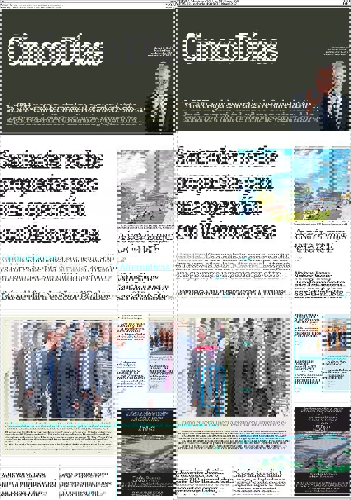 CINCO DÍAS: "Santander recibe propuestas para una operación con Metrovacesa"; "Así será el campos vertical del IE"; "Fridman señala en la Audiencia a Pérez Dolset por la quiebra de Zed".