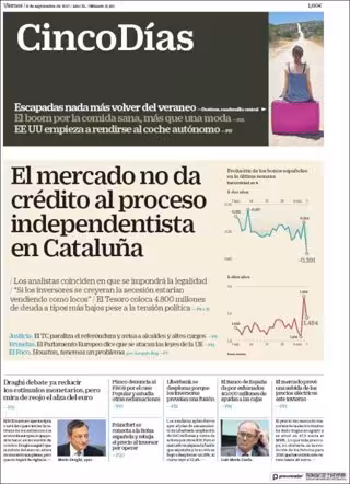 CINCO DÍAS: "El mercado no da crédito al proceso independentista en Cataluña"; "Draghi debate ya reducir los estímulos monetarios, pero mira de reojo el alza el euro"; "El boom de la comida sana, más que una moda".