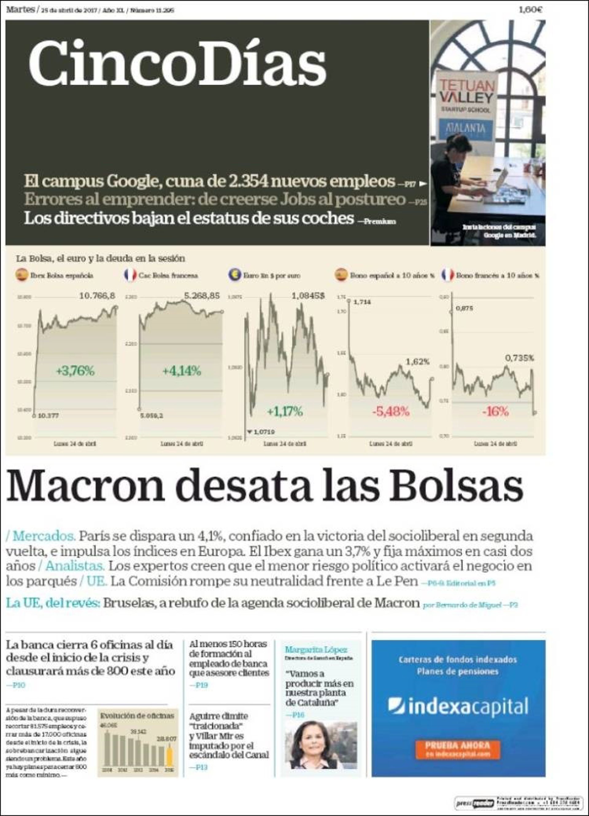 CINCO DÍAS: "Macron desata las Bolsas"; "Campus Google, cuna de 2.354 nuevos empleos"; "Errores al empreder: de creerse Jobs al postureo"; "Los directivos bajan el estatus de sus coches".
