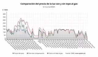 A este precio del 'pool' se sumaría la compensación a las gasistas, que tiene que ser abonada por los consumidores beneficiarios de la medida, los consumidores de la tarifa regulada (PVPC) o los que, a pesar de estar en el mercado libre, tienen una tarifa indexada, pero para este viernes se situará nuevamente en 0 euros/MWh, situación que se repite desde el pasado 27 de febrero.