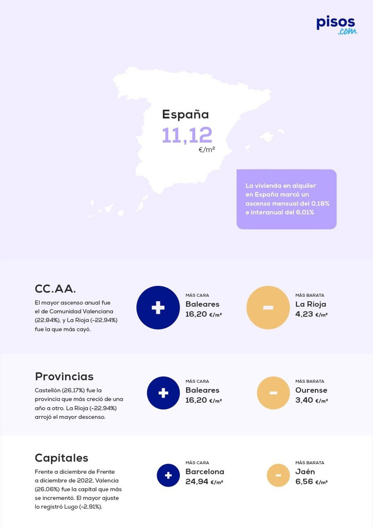 El precio medio del alquiler en España cierra 2023 con un alza anual del 6,01% hasta los 11,12 euros por metro cuadrado, según pisos.Com. - PISOS.COM