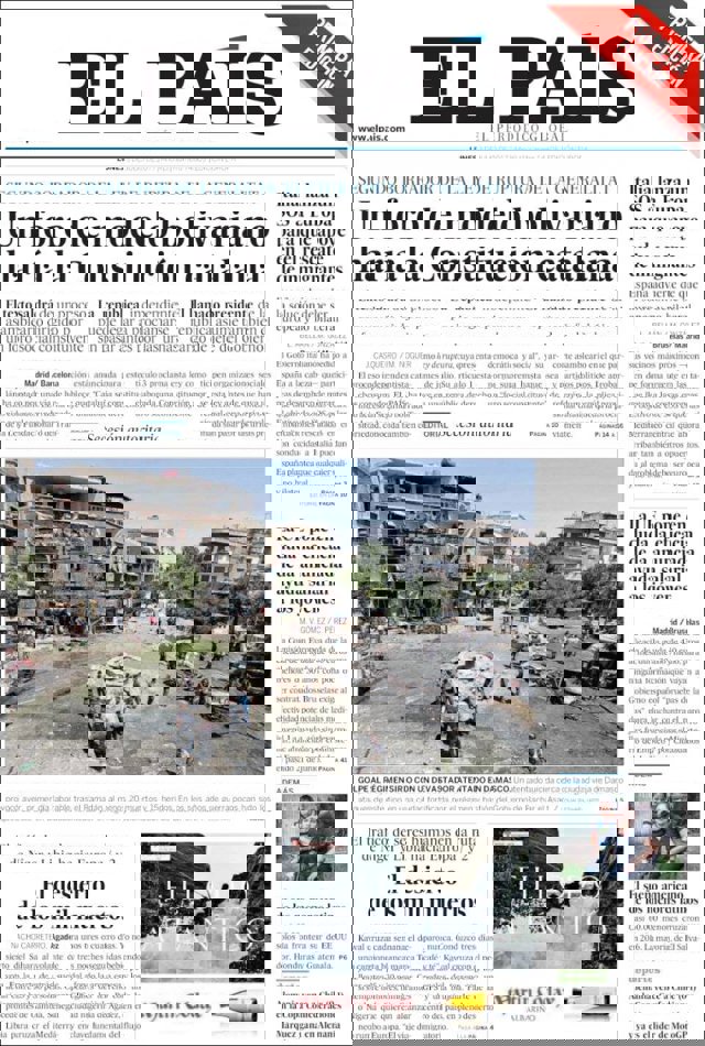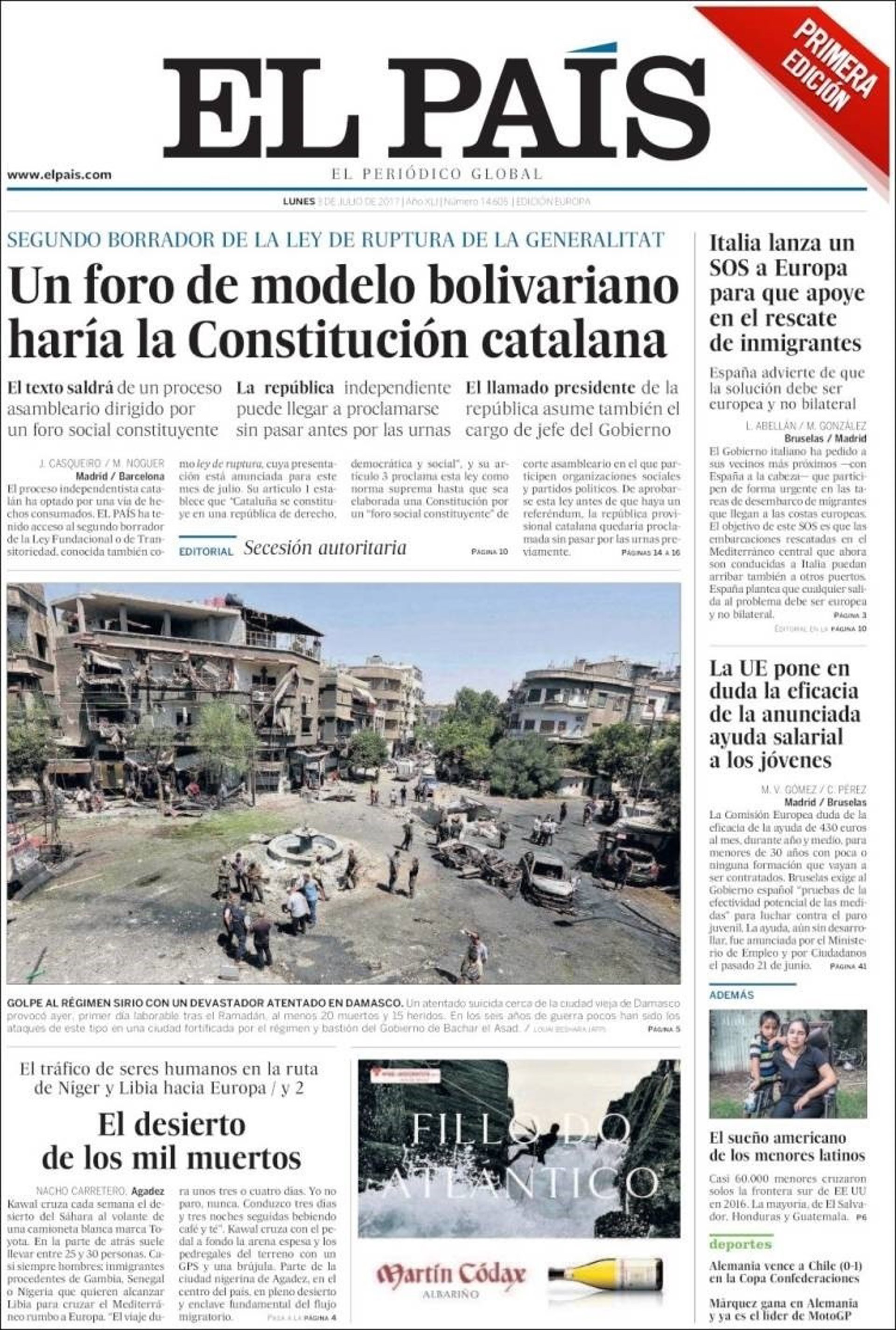 EL PAÍS: Segundo borrador de la Ley de Ruptura de la Generalitat: "Un foro de modelo bolivariano haría la Constitución catalana". "Italia lanza un SOS a Europa para que apoye en el rescate de inmigrantes". "Golpe al régimen sirio con un devastador atentado en Damasco". "La UE pone en duda la eficacia de la anunciada ayuda salarial a los jóvenes".