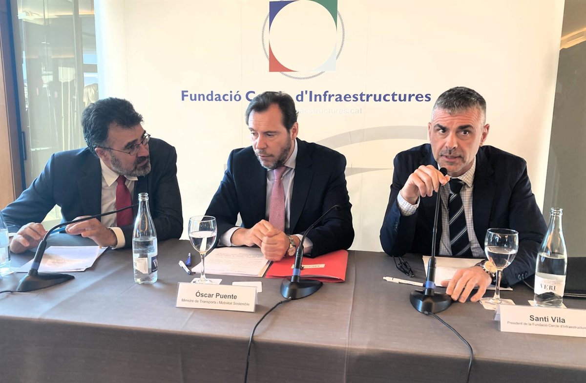El presidente del Puerto de Barcelona, Lluís Salvadó; el ministro de Transportes y Movilidad Sostenible, Oscar Puente, y el presidente de la Fundación Cercle d'Infraestructures, Santi Vila. - EUROPA PRESS