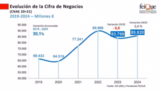 Desde 2019, la cifra de negocios de la industria química acumulará un crecimiento del 30,1% hasta 2024, aunque este crecimiento no está vinculado a la mejora de los niveles y capacidades productivas, sino fundamentalmente a los precios de los productos químicos, que en el periodo han crecido un 28,4%.