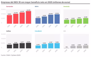 De su lado, BBVA vuelve a lograr un beneficio histórico de 10.511 millones de euros en el conjunto del 2025, lo que supone un incremento del 4,5% en comparación con el año anterior.