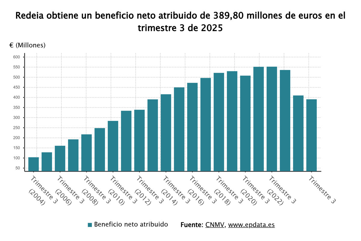 Redeia obtuvo un beneficio neto de 389,8 millones de euros en los nueve primeros meses del año, lo que representa una caída del 4,6% con respecto al mismo periodo del ejercicio anterior, informó la compañía, que añadió que este resultado está en línea con las previsiones del grupo.